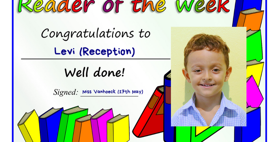 17th May 2019: Readers of the WeekMay 20, 20191 min read Congratulations to: Levi, Emily, Tabitha, Alisa, Cream and Aiden! Keep reading...Click here to see the historical list of Readers of the Week in Primary School