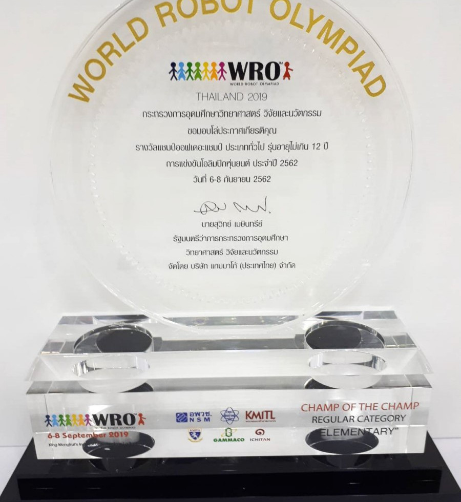Congratulations to Leon (Year 6) and Wha Wha (Year 4) whose team won first place in the Under 12 category at this Year's World Robotic Olympiad winning the prestigious "Champ of Champ" award.